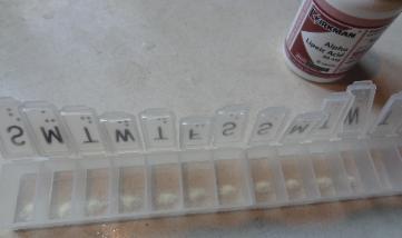 1. Open capsule and pour it evenly into piles in the pill boxes. Stop when you've used about 3/4 of it.