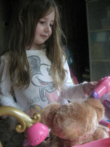 When Caroline woke up, she ran right to her playroom to see her bear. As she played (with no computer in